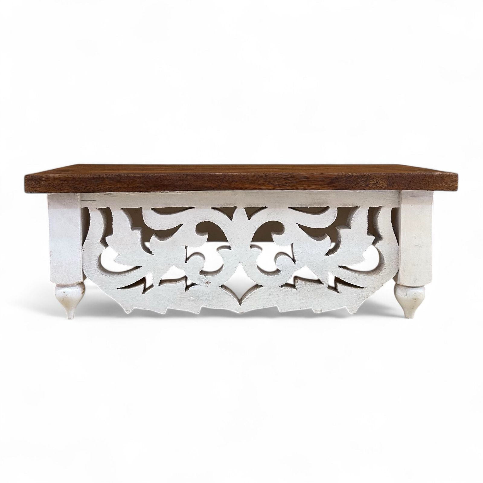 The shelf's unique charm lies in its intricately carved white base. The delicate, openwork design showcases traditional Indian motifs, adding a touch of elegance and visual interest to any wall. The contrast between the dark wood top and the white carved base creates a striking aesthetic that complements a variety of interior styles, from bohemian and farmhouse to globally inspired and eclectic.