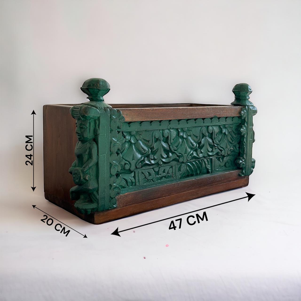 This vintage reclaimed wood wall shelf brings a touch of rustic charm and history to any space. Crafted from carefully selected reclaimed wood, each piece tells a unique story through its natural imperfections, grains, and variations in tone. The rich, warm hues of the wood are beautifully complemented by the intricately carved, dark green accents on the front and sides, showcasing traditional artistry.