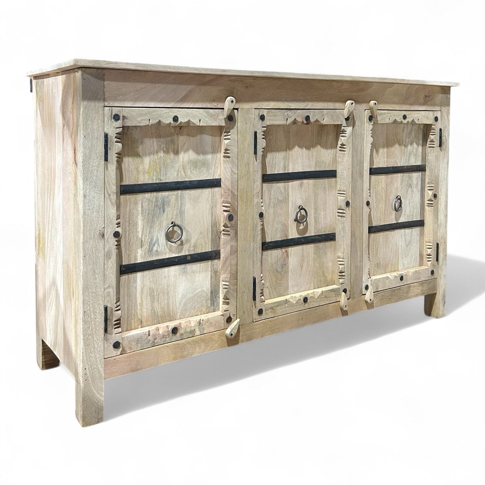 Solid Mango Wood Sideboard offers a harmonious blend of rustic charm and practical storage. Handcrafted from robust mango wood, celebrated for its durability and unique grain patterns, this piece brings a touch of natural warmth and artisanal character to any room.