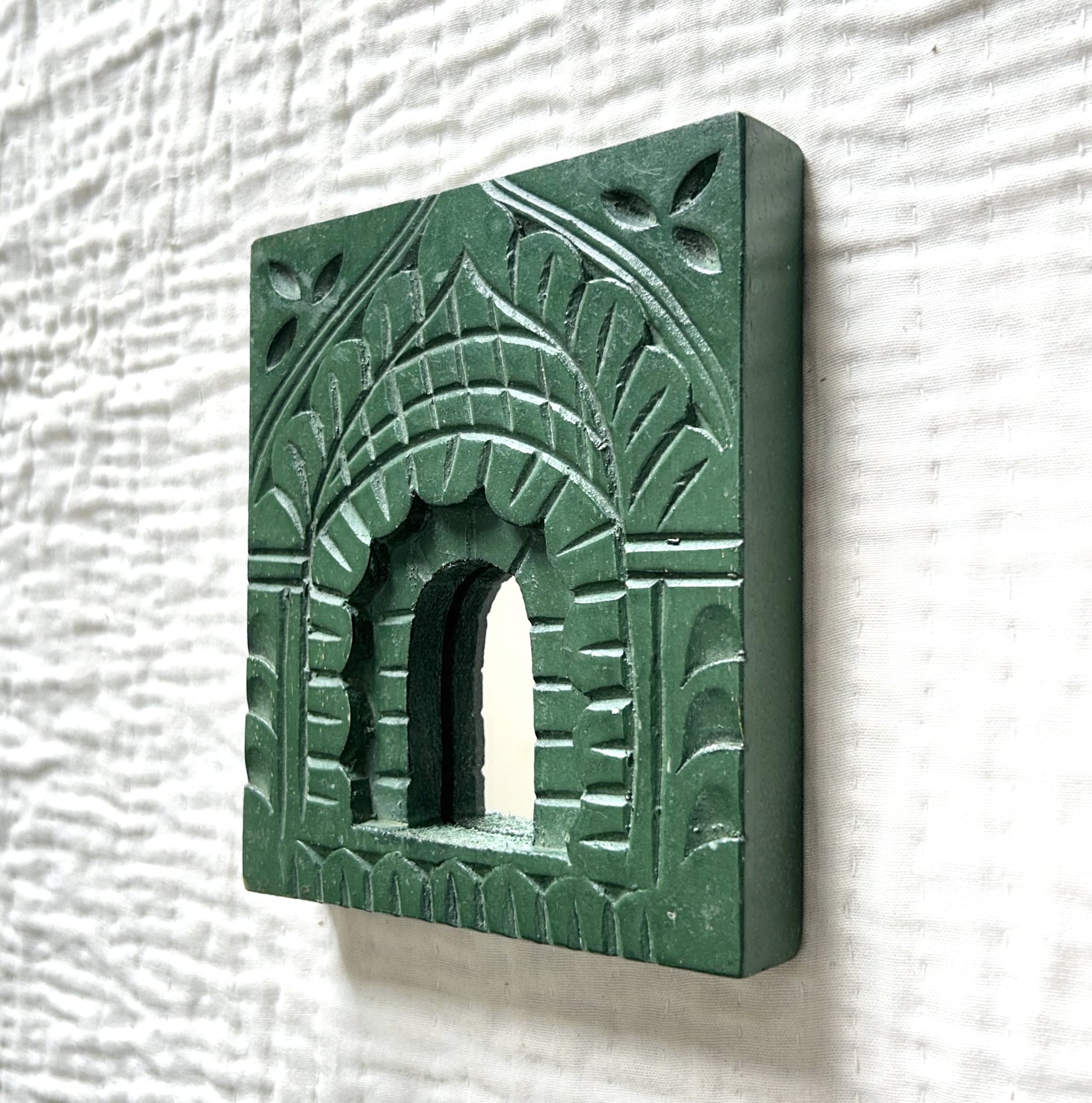 Bring a royal touch to your home décor with this handcrafted wooden jharokha mirror frame. Inspired by traditional Rajasthani architecture, each piece features intricate carvings and mini mirrors that add a charming ethnic flair to any wall.