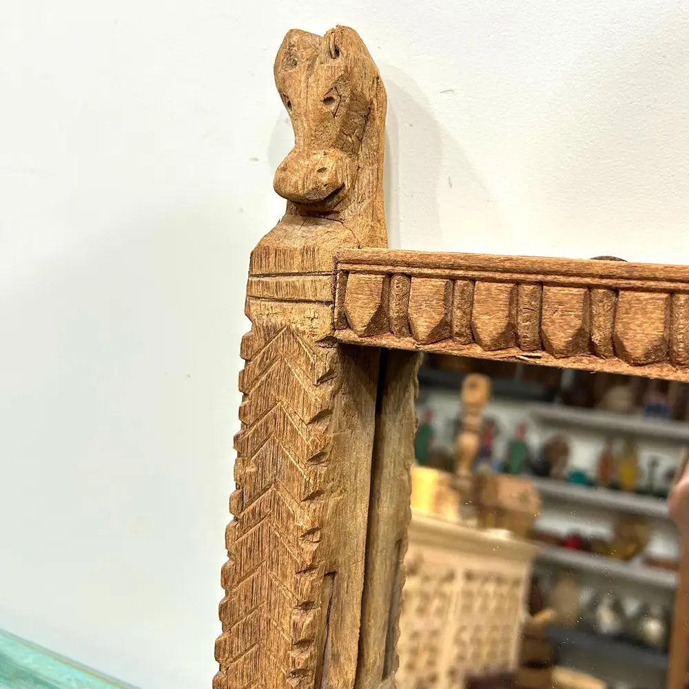 Add a touch of traditional charm to your home with this Vintage Wooden Carved Mirror Frame. Handcrafted from natural wood, this unique piece features intricate carvings along the top and two pillar-like sides that showcase fine Indian craftsmanship. The rustic finish enhances its timeless appeal, making it a perfect accent for your entryway, living room, or bedroom wall.